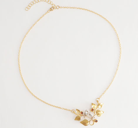 The pendant vines & leaves are 14K gold plated surrounding two sterling silver birds. The berries are natural 3mm round red garnet cabochons. The chain with lobster clasp is 14K gold filled. Birds and vines are made using the lost wax casting process.